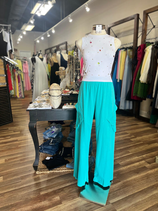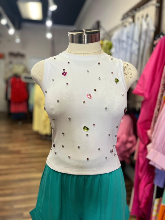 SLEEVELESS SHIRT WITH RHINESTONES