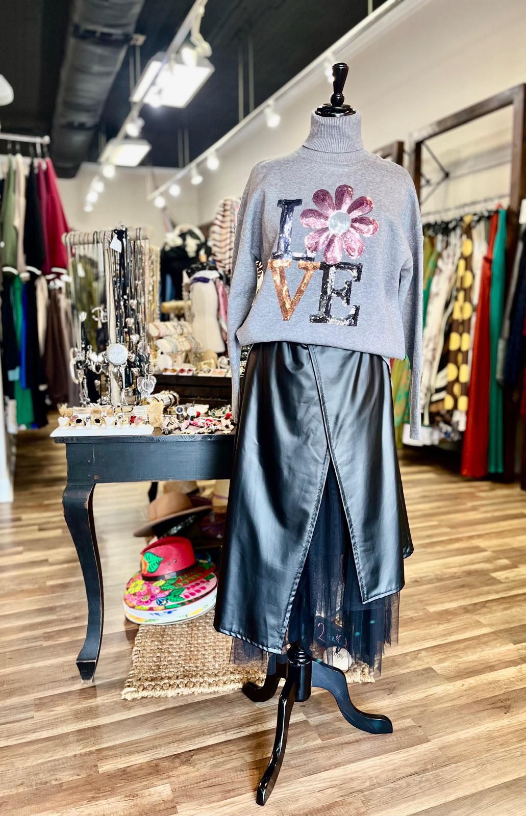 Elevate your style with the Sequin Flower Love Turtleneck Sweater, crafted from a luxurious blend of viscose, elastane, and nylon for a soft, stretchy fit that moves with you. Delicate sequined floral accents add a touch of sparkle, making it perfect for both casual outings and special occasions. Stay cozy and chic while expressing your unique personality effortlessly.